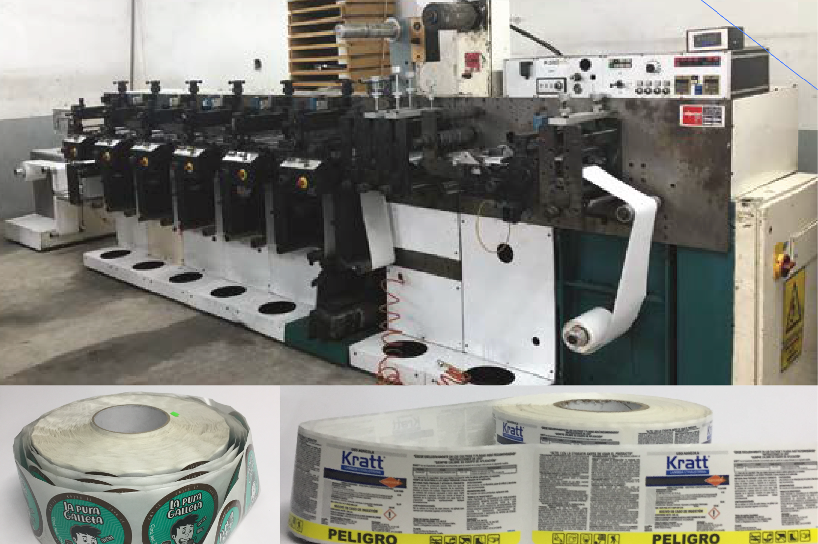 Contamos con 1 máquina de impresión de 6 colores y 4 estaciones de terminados, en la que se pueden desarrollar diferentes tipos de etiquetas y envolturas, en diferentes materiales como son:
